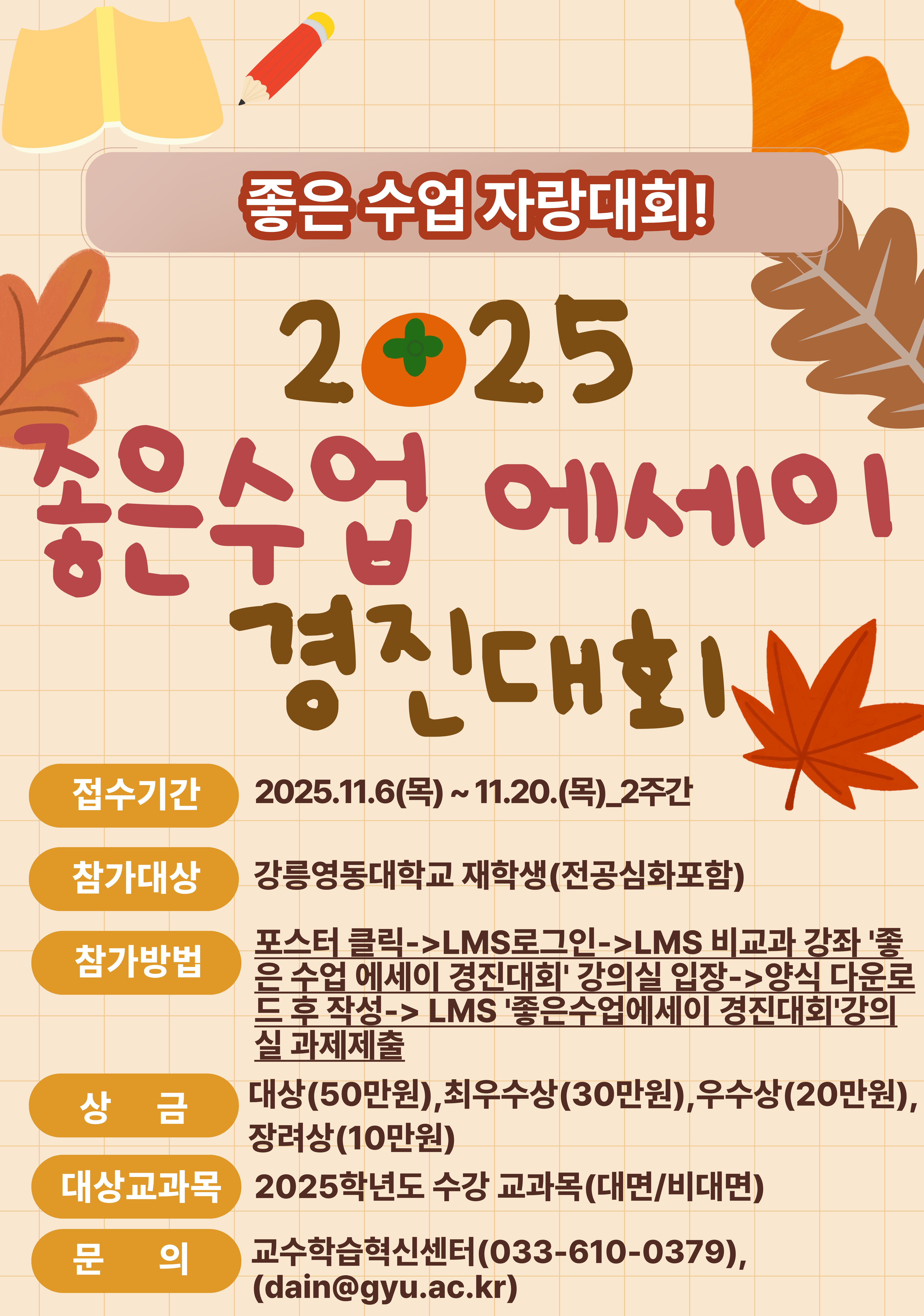 - 강릉영동대학교 RISE사업단 : 천효순 (033-610-0400 gytns1000@gyu.ac.kr)