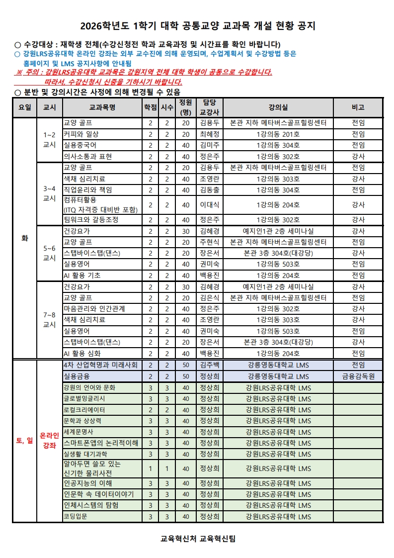2026학년도 1학기 대학 공통교양 교과목 개설 현황을 다음과 같이 공지합니다.